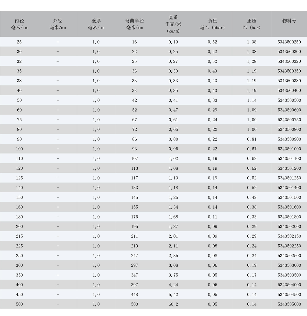 基于不同的安裝和操作環境,壓強指數可能會與表格中標注的有所不同。 若有所疑慮,請描述您想應用在什么工況,我 們很樂意為您提供建議。我們可以依據用戶的要求提供不同尺寸、顏色和誤差的軟管。技術參數 (20°C):01/2020.