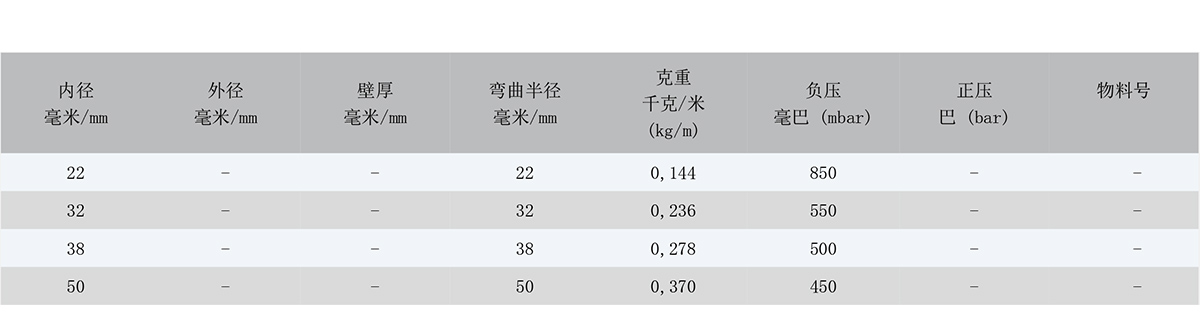 基于不同的安裝和操作環境,壓強指數可能會與表格中標注的有所不同。 若有所疑慮,請描述您想應用在什么工況,我 們很樂意為您提供建議。我們可以依據用戶的要求提供不同尺寸、顏色和誤差的軟管。技術參數 (20°C): 01/2020.