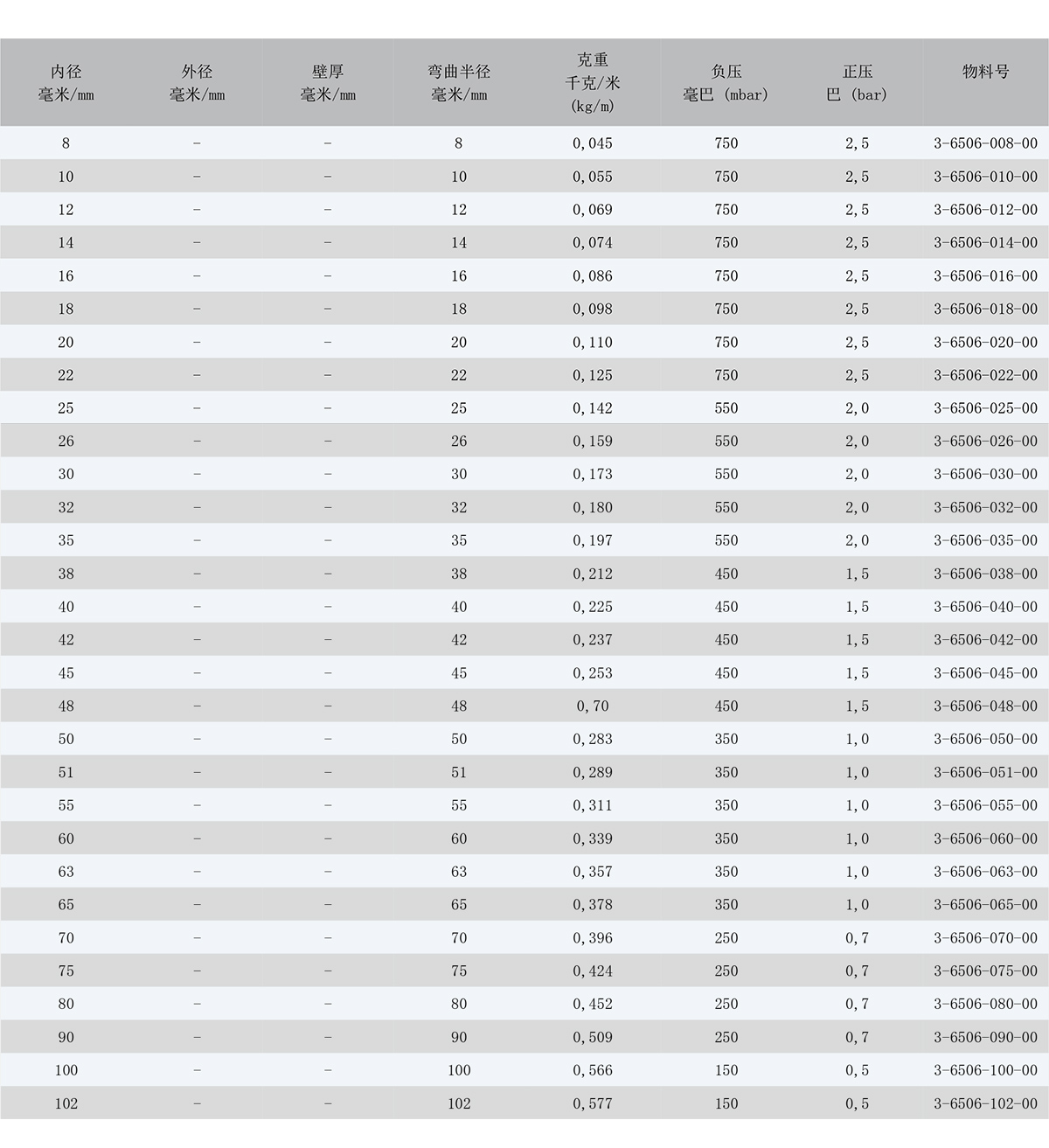 基于不同的安裝和操作環境,壓強指數可能會與表格中標注的有所不同。 若有所疑慮,請描述您想應用在什么工況,我 們很樂意為您提供建議。我們可以依據用戶的要求提供不同尺寸、顏色和誤差的軟管。技術參數 (20°C): 01/2020.