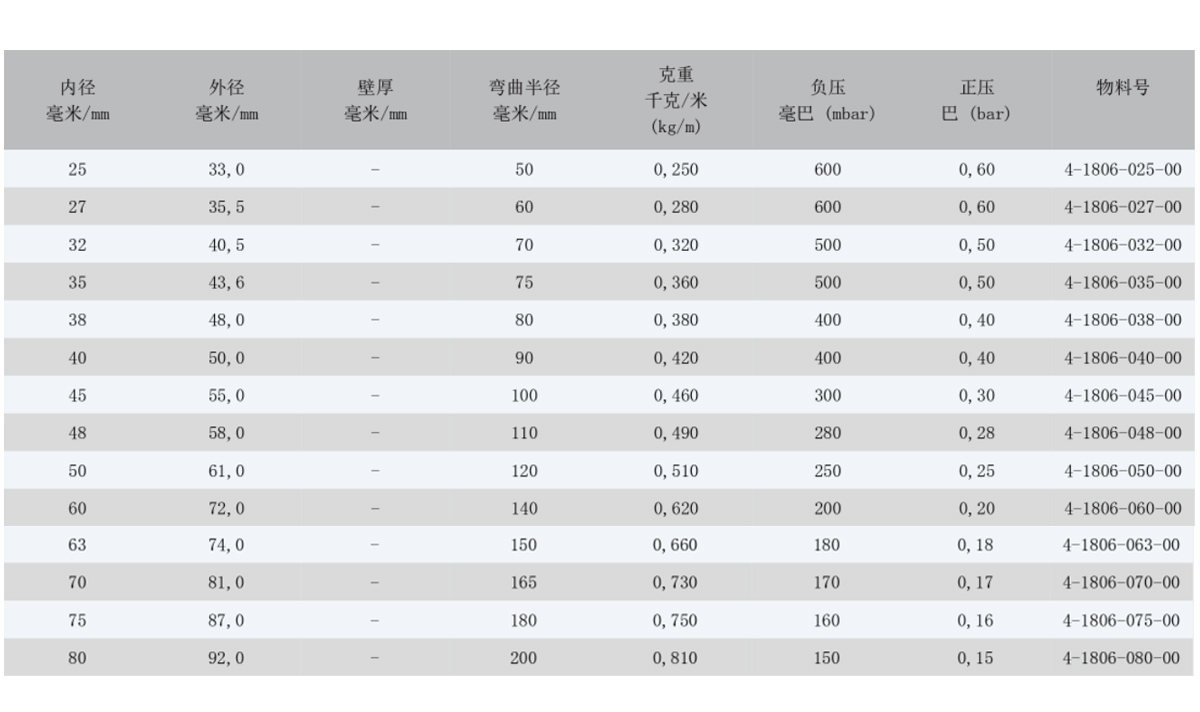 基于不同的安裝和操作環(huán)境,壓強(qiáng)指數(shù)可能會(huì)與表格中標(biāo)注的有所不同。 若有所疑慮,請(qǐng)描述您想應(yīng)用在什么工況,我 們很樂意為您提供建議。我們可以依據(jù)用戶的要求提供不同尺寸、顏色和誤差的軟管。技術(shù)參數(shù) (20°C): 01/2020.