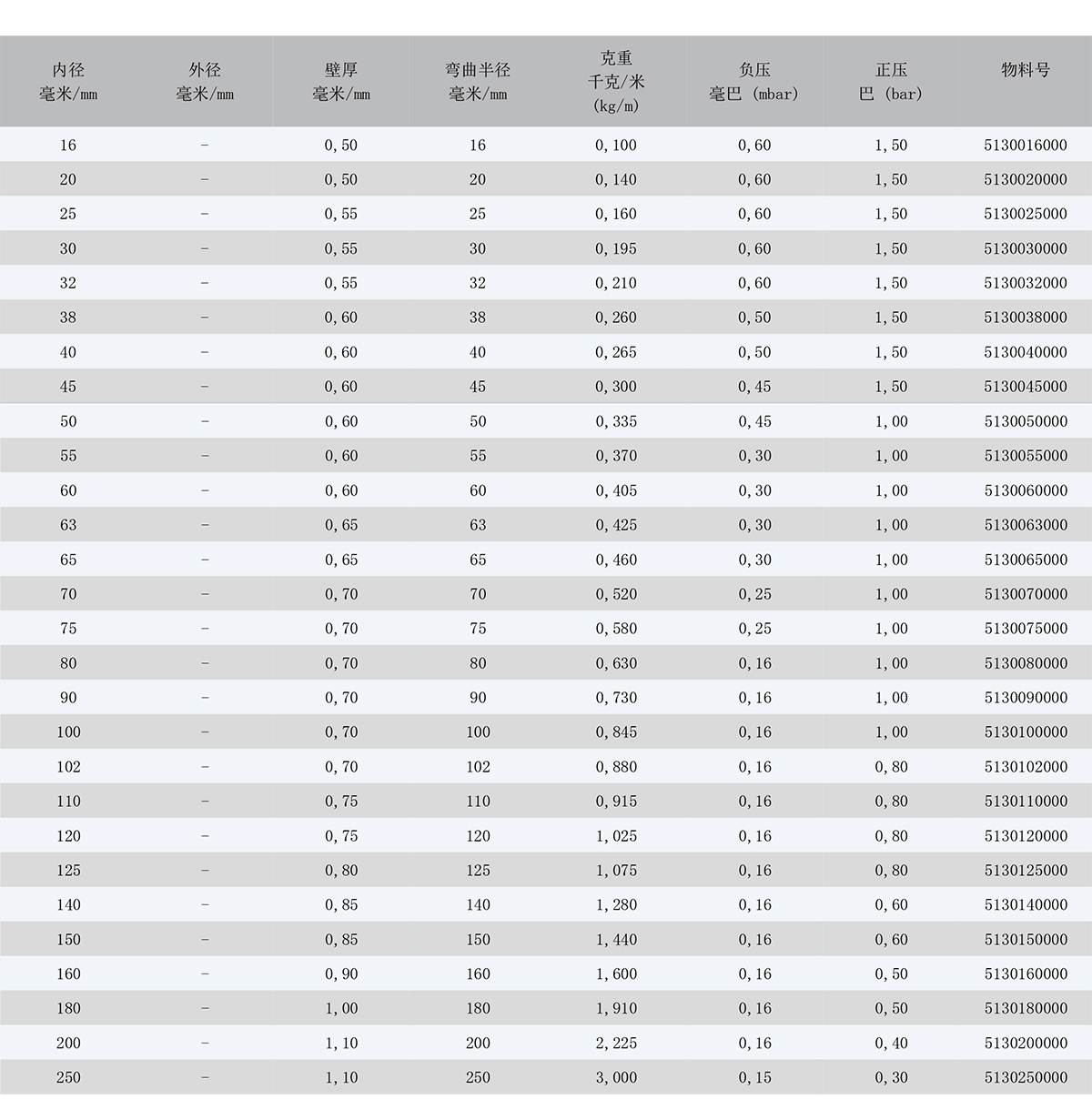 基于不同的安裝和操作環境,壓強指數可能會與表格中標注的有所不同。 若有所疑慮,請描述您想應用在什么工況,我 們很樂意為您提供建議。我們可以依據用戶的要求提供不同尺寸、顏色和誤差的軟管。技術參數 (20°C):01/2020.