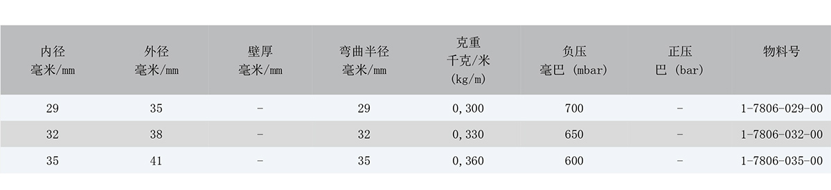 基于不同的安裝和操作環境,壓強指數可能會與表格中標注的有所不同。 若有所疑慮,請描述您想應用在什么工況,我 們很樂意為您提供建議。我們可以依據用戶的要求提供不同尺寸、顏色和誤差的軟管。技術參數 (20°C):01/2020.