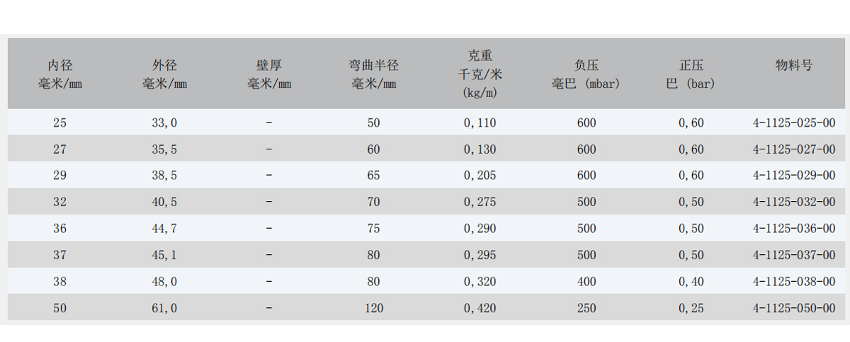 基于不同的安裝和操作環(huán)境,壓強指數(shù)可能會與表格中標注的有所不同。 若有所疑慮,請描述您想應用在什么工況,我 們很樂意為您提供建議。我們可以依據(jù)用戶的要求提供不同尺寸、顏色和誤差的軟管。技術參數(shù) (20°C): 01/2020.