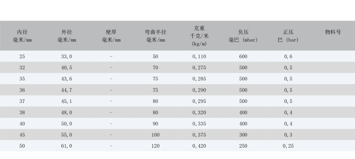 基于不同的安裝和操作環(huán)境,壓強指數(shù)可能會與表格中標注的有所不同。 若有所疑慮,請描述您想應(yīng)用在什么工況,我 們很樂意為您提供建議。我們可以依據(jù)用戶的要求提供不同尺寸、顏色和誤差的軟管。技術(shù)參數(shù) (20°C): 01/2020.