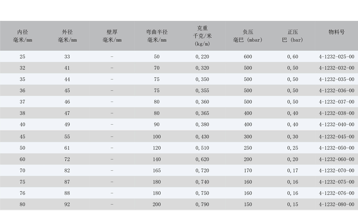 基于不同的安裝和操作環(huán)境,壓強指數(shù)可能會與表格中標注的有所不同。 若有所疑慮,請描述您想應(yīng)用在什么工況,我 們很樂意為您提供建議。我們可以依據(jù)用戶的要求提供不同尺寸、顏色和誤差的軟管。技術(shù)參數(shù) (20°C): 01/2020.