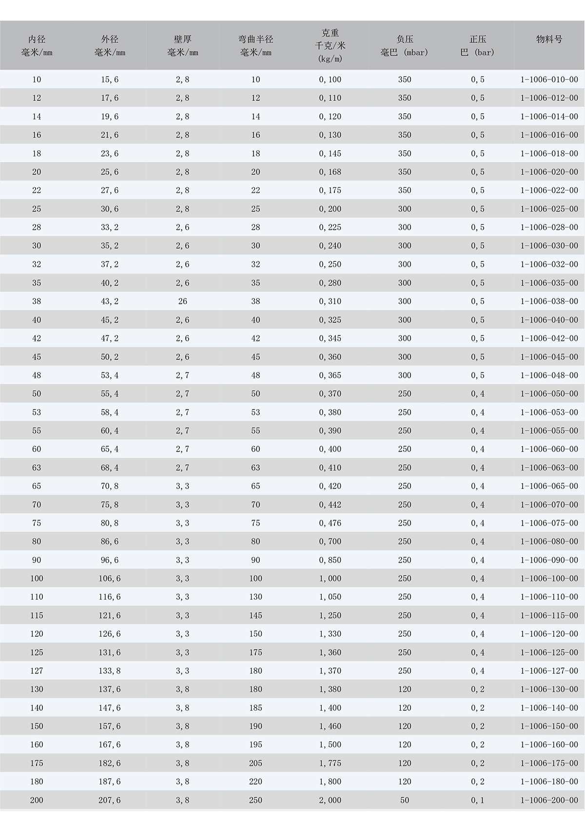 基于不同的安裝和操作環(huán)境,壓強指數(shù)可能會與表格中標注的有所不同。 若有所疑慮,請描述您想應(yīng)用在什么工況,我 們很樂意為您提供建議。我們可以依據(jù)用戶的要求提供不同尺寸、顏色和誤差的軟管。技術(shù)參數(shù) (20°C):01/2020.