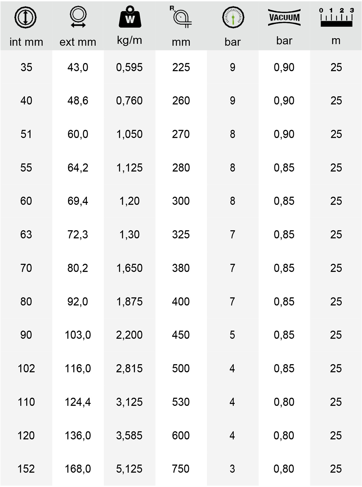 基于不同的安裝和操作環(huán)境,壓強指數(shù)可能會與表格中標(biāo)注的有所不同。 若有所疑慮,請描述您想應(yīng)用在什么工況,我 們很樂意為您提供建議。我們可以依據(jù)用戶的要求提供不同尺寸、顏色和誤差的軟管。技術(shù)參數(shù) (20°C):01/2020.