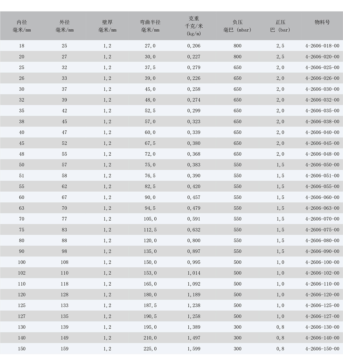 基于不同的安裝和操作環(huán)境,壓強(qiáng)指數(shù)可能會與表格中標(biāo)注的有所不同。 若有所疑慮,請描述您想應(yīng)用在什么工況,我 們很樂意為您提供建議。我們可以依據(jù)用戶的要求提供不同尺寸、顏色和誤差的軟管。技術(shù)參數(shù) (20°C):01/2020.